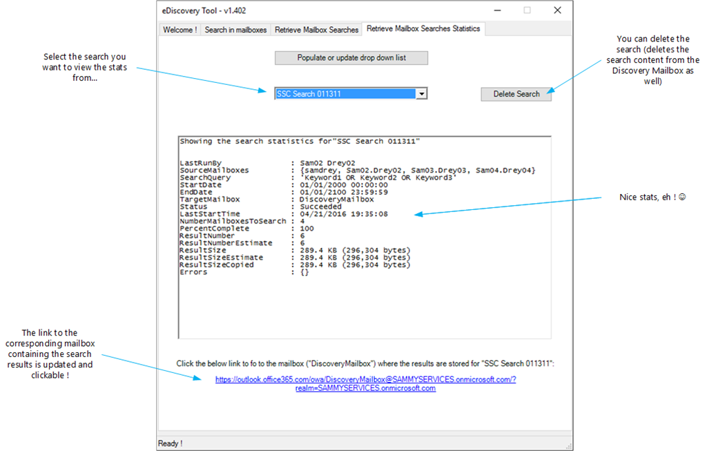 This tab enables you to retrieve the statistics of searches, and as a bonus, will give you the link to connect directly, using OWA, to the Discovery Mailbox used for that given search.