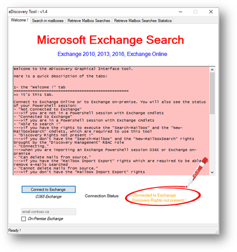 Figure 4 – Connected to Exchange, have Discovery Management rights, but no Mailbox Import Export rights mandatory to be able to purge searched items from source mailbox