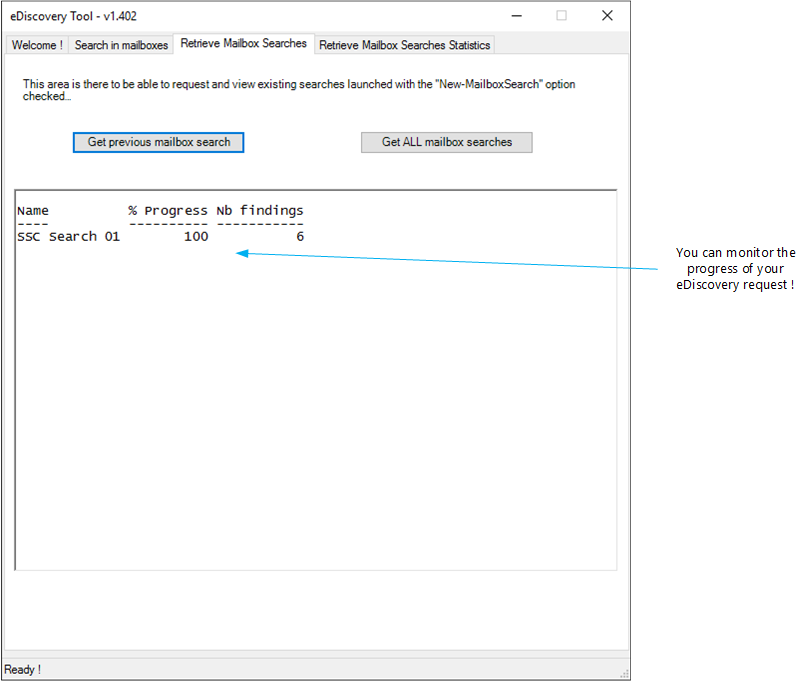 Just click on the “Get previous mailbox search” button to check when the Exchange server will have the search complete. The other button will show the status of all previous searches (only the ones performed with “New-MailboxSearch” – see previous Tab):